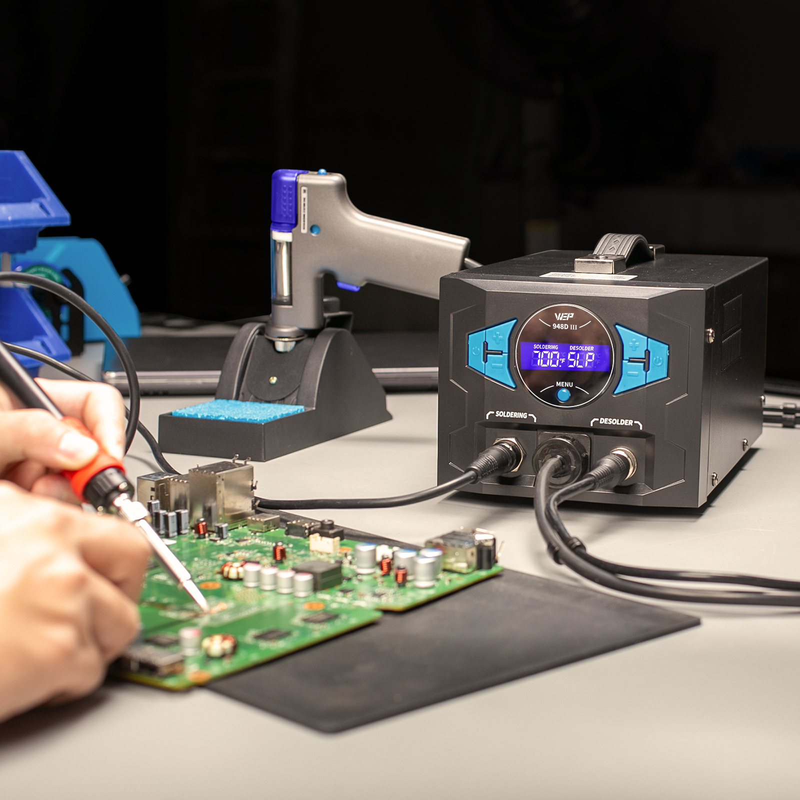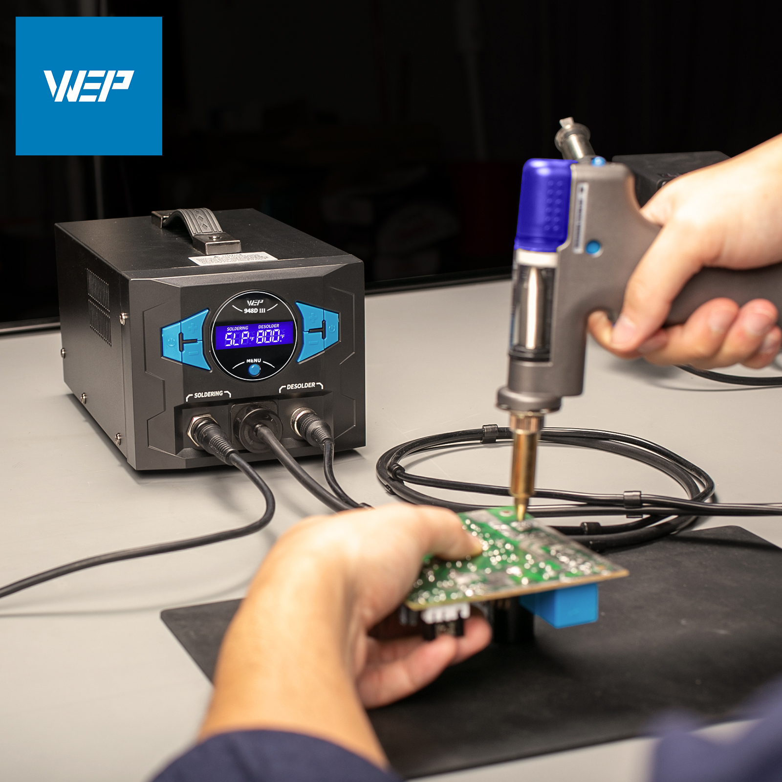 - Uses detachable desoldering and soldering handpieces for easy replacement.